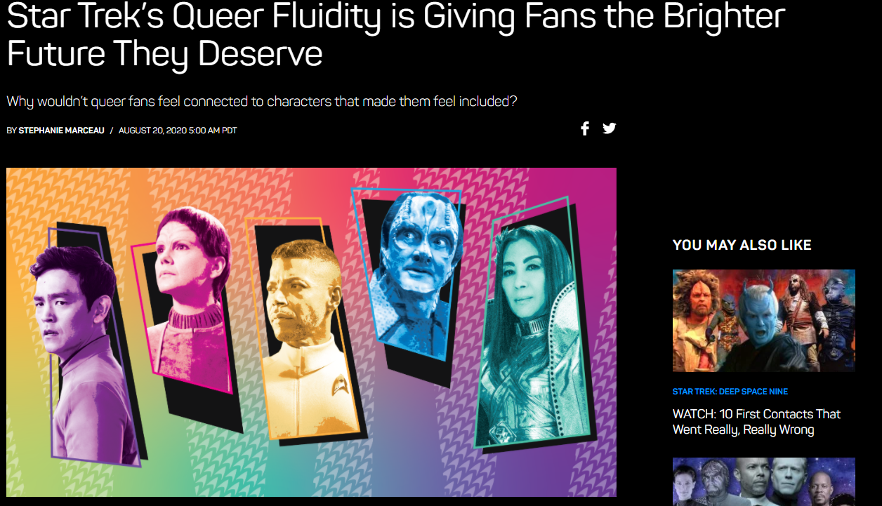 I have published three different articles on Star Trek’s official site: “Star Trek’s Queer Fluidity is Giving Fans the Brighter Future They Deserve”, “The Ballad of Lon Suder | Star Trek Tackles Mental Illness“, “Nog and the Post-Traumatic Progress of Star Trek Characters“, and What The Mariner-Freeman Family says about Starfleet and the Star Trek Community. The former describes the influence Star Trek has had on representing gender and sexual fluidity before the series was more open with its support of the queer community. From Garak’s omni-sexual nature to Spirk itself, my piece will be connecting all those fandom moments that make Trek feel so acceptingly queer. The middle is a personal essay about connecting my own journey with bipolar disorder to one of Star Trek Voyager’s surprisingly humanizing depictions of mental illness. Finally, and most recently, I discussed how revolutionary Nog’s depiction of PTSD was for representation and the way Star Trek handles the emotional trauma of its own characters.